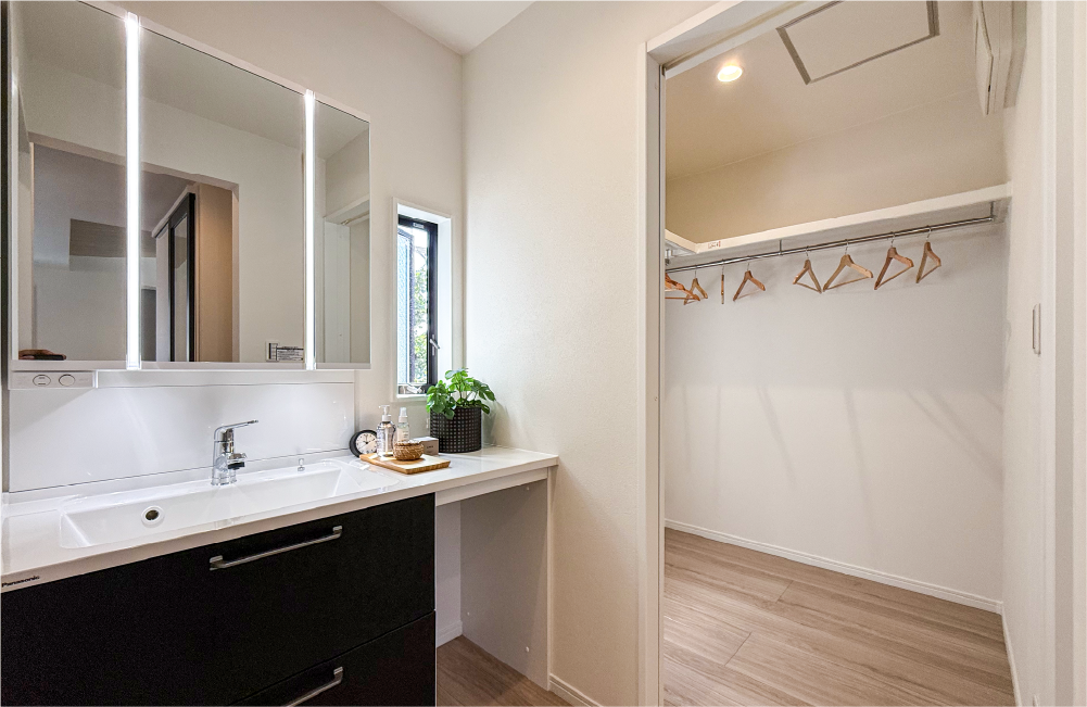 玄関を入ってすぐの場所にセカンド洗面を設置し、帰宅後すぐに手洗いやうがいができるようにしました。玄関ホールにあるため、お客様も気軽に利用できます。さらに、主寝室からも近く、寝る前や身支度の際にわざわざ2階へ行く手間が省けるため、より便利に使えます。