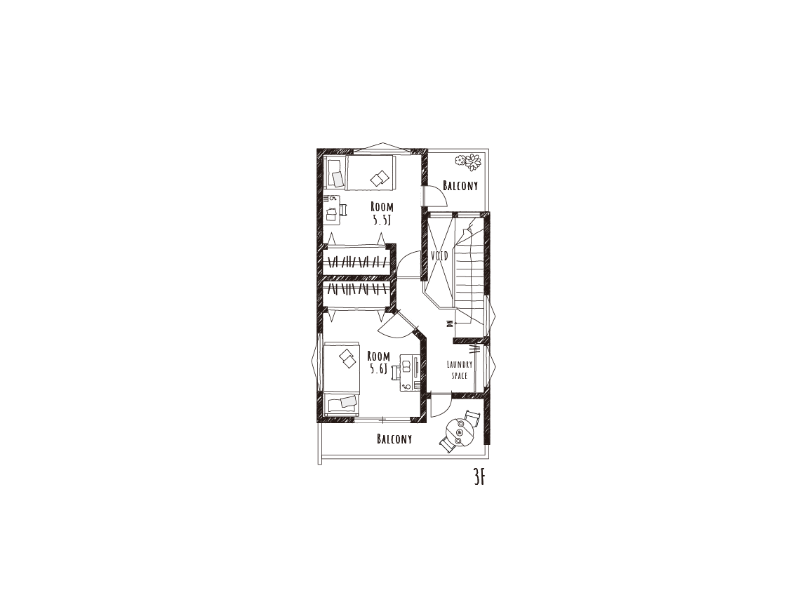 3階の階段を上がってすぐ、間口いっぱいに広がるワイドなバルコニー。たっぷりの洗濯物もゆったり干せる、うれしいスペースです。さらに、バルコニーの手前には室内ランドリースペースも設けました。天気を気にせず洗濯ができ、急な雨でもサッと取り込んでそのまま干せて、とても便利です。