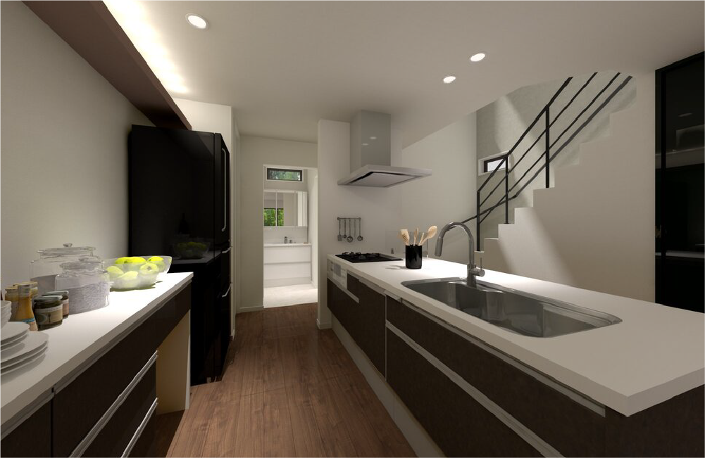 家の中心にある、使い勝手の良いペニンシュラキッチン。ぐるっと回れる動線で、家事もスムーズに。目の前にはアイアン手すりを設置した吹抜け階段があり、開放感もたっぷり。LDK全体を見渡せるので、リビングで遊ぶお子さまの様子を見守りながら、安心してお料理ができます。