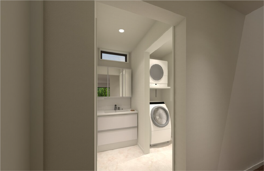 家族の誰かが入浴中でも気兼ねなく洗面台を使えるよう、洗面室と脱衣室をセパレートにしました。また、キッチンのすぐ隣にあるので、料理の合間に洗濯機を回したりと、家事をスムーズにこなすことができます。家事動線に配慮したプランニングで、毎日の暮らしを快適にします。