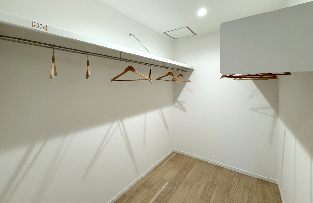 主寝室にはウォークインクローゼットを設けて、ご夫婦の洋服等をしっかり収納できるスペースを確保しました。すぐ隣には、メイクスペースとしても使える造作カウンターを設置。さらに、扉を開けたところにはセカンド洗面もあり、メイクから着替えまで朝の身支度がスムーズに行えます。