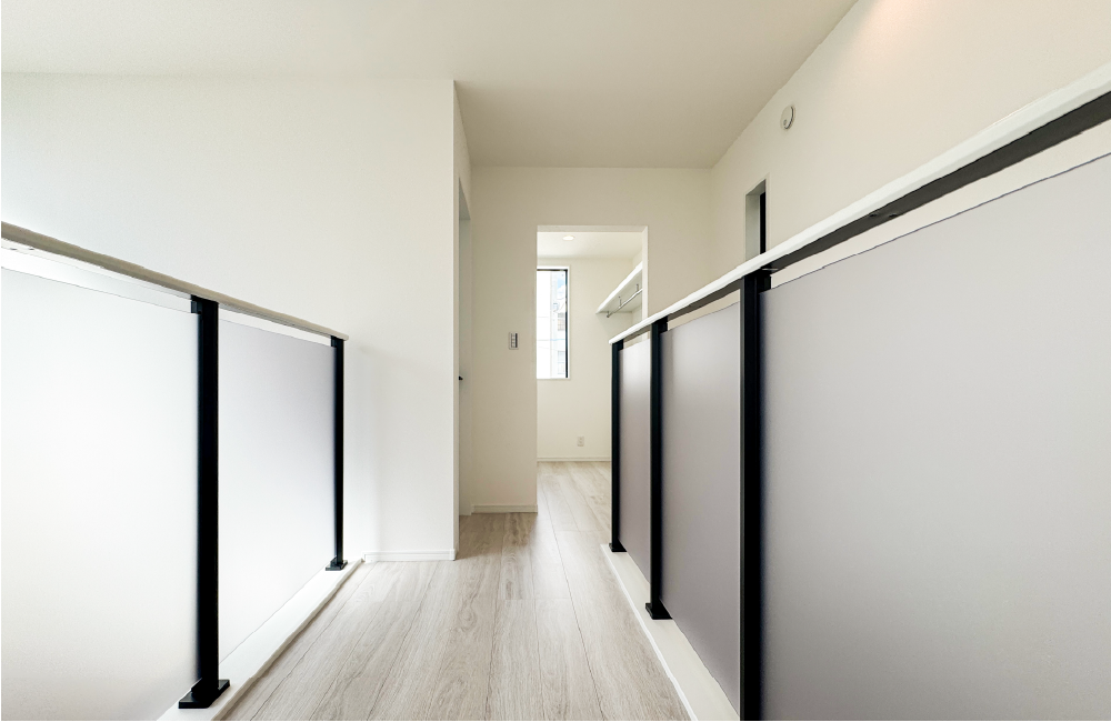 3階のホールは吹抜けに面しており、階下とやわらかくつながっているため、リビングでくつろぐ家族の様子を感じることができます。アルミ手すりと樹脂パネルを採用し、圧迫感をおさえた抜け感のあるデザインに仕上げました。光がやさしく通り抜けるこの場所は、心地よい開放感に包まれます。