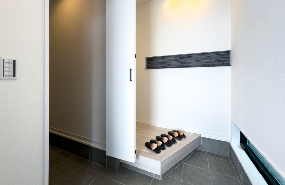 家族用の玄関を兼ねたシューズクローゼットには、靴はもちろん、ガーデニング用品やお子さまの外遊び用おもちゃもサッと収納できます。玄関ホールには、アウターやレインコートなどを掛けられるハンガーパイプを設置。お出かけ前の身支度や、雨の日の帰宅時にもとても便利です。