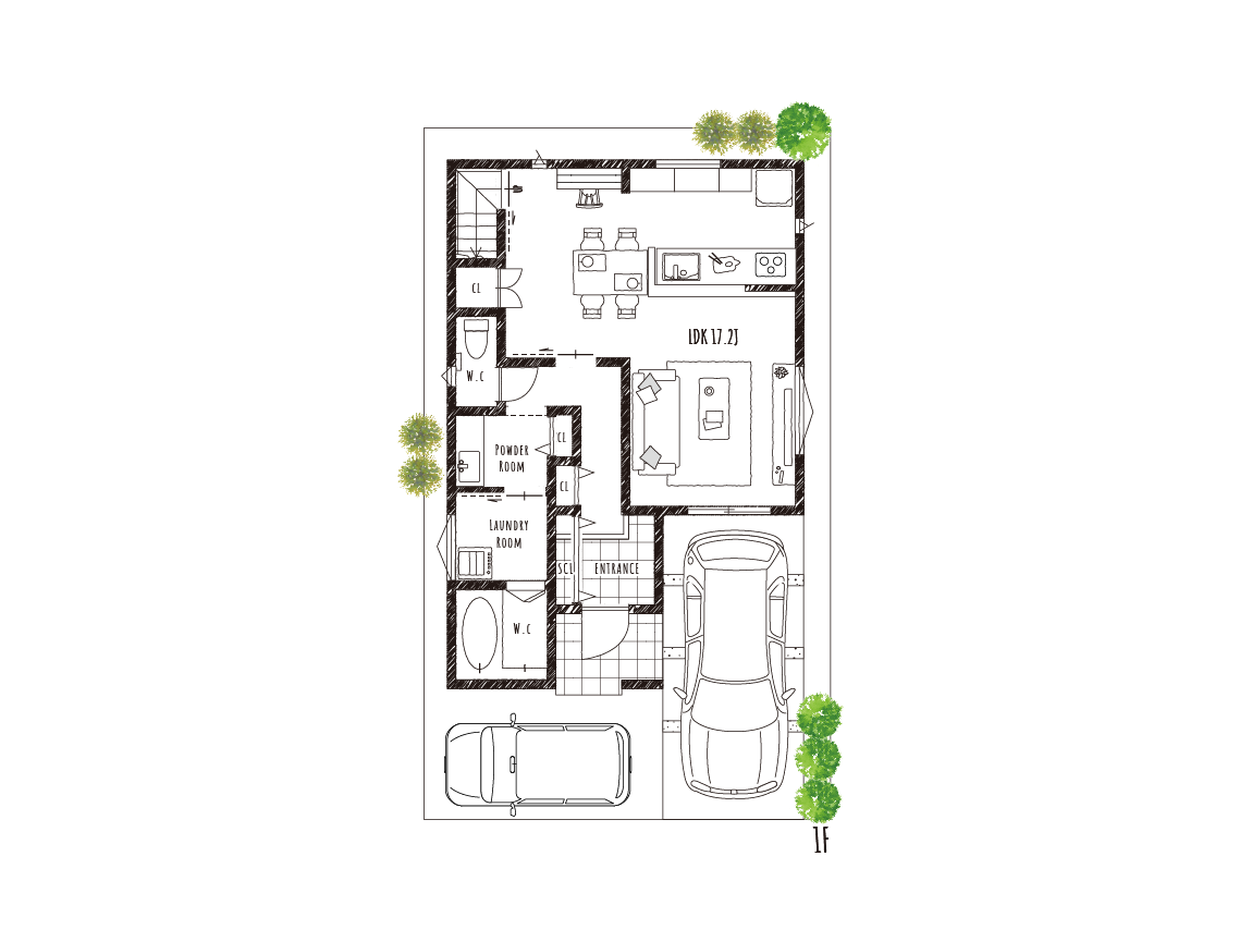 ダイニングとキッチンが横並びだから、料理の配膳も後片付けもスムーズ。キッチン横のカウンターは、家事コーナーとして使えるほか、お料理の合間にひと息つく場所にもぴったりです。さらに、キッチンからはリビングやダイニングが見渡せるので、家事をしながらでも家族の笑顔を感じられます。
