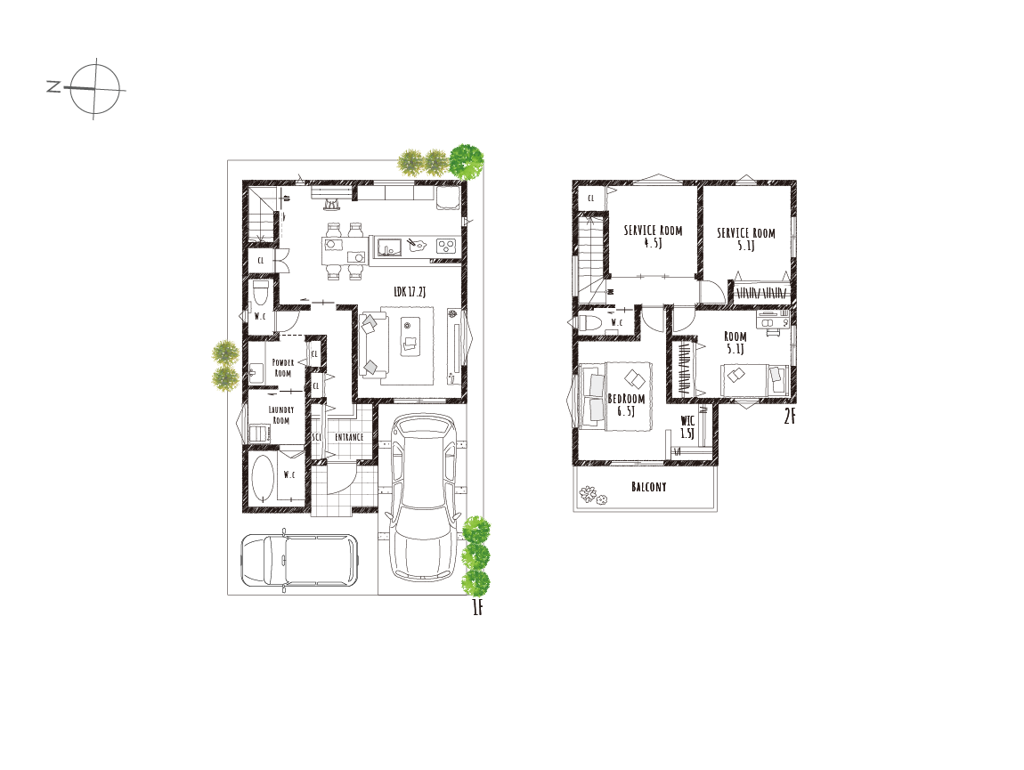 2階に上がってすぐのサービスルームは、暮らしを支える便利なスペースとして活用できます。天候や時間を気にせず、たっぷりの洗濯物を干せるランドリースペースとして使えるほか、収納棚を設ければ、季節家電や日用品のストックをまとめてしまえる家族共用の収納スペースとしても活躍します。