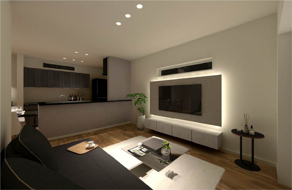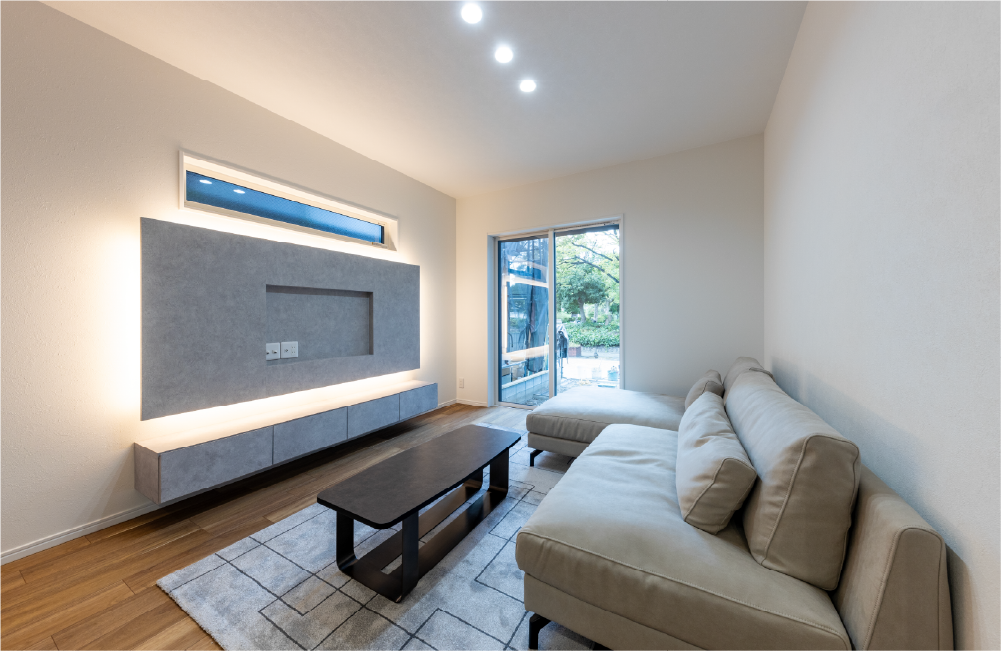 南側と西側に設けた窓から陽光がたっぷりと差し込み、リビングは明るく開放的な雰囲気に包まれます。テレビ背面のフカシ壁に仕込んだ間接照明がやさしく灯り、夜は落ち着いた空間を演出します。さらに、フロートタイプのテレビボードを採用し、見た目もスッキリとした印象に仕上げています。