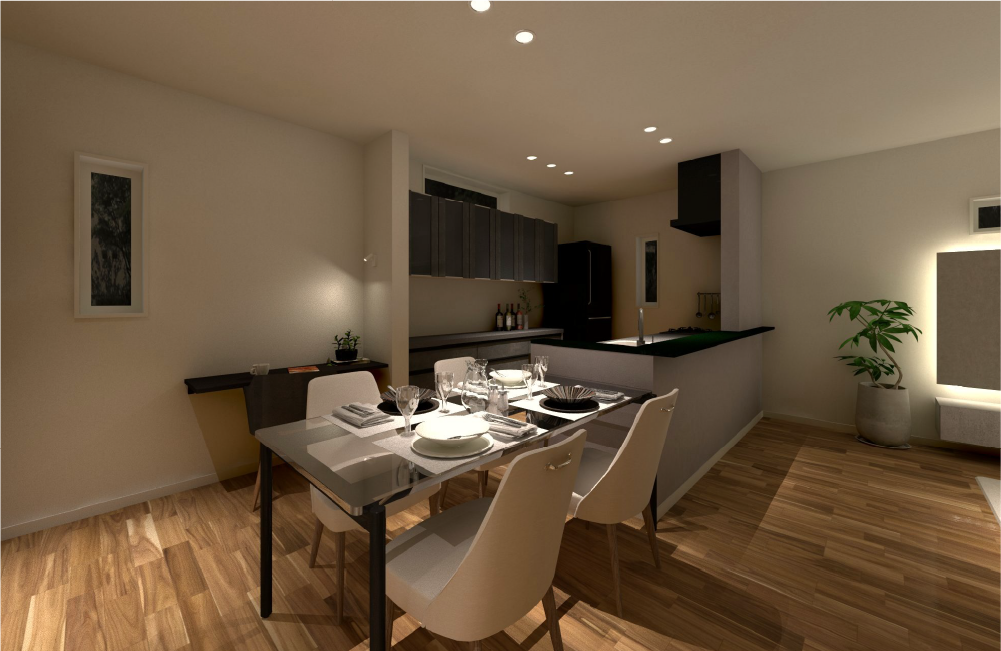 家事をしながらでも、ふと顔を上げれば家族の笑顔や気配を感じられる、ぬくもりに満ちた心地よいお家です。キッチンとダイニングは横並びの配置で、食事の配膳や後片付けもスムーズ。お子さまも自然とお手伝いしやすく、家族みんなで協力しながら過ごせる工夫がちりばめられています。対面式のキッチンからは、リビングやダイニングを見渡すことができ、お料理中も会話が弾み、家族のつながりを感じられるのも嬉しいポイント。LDK全体は天井高約2.5mのゆったりとした空間で、二面に設けた開口部から差し込む光がリビングを明るく包みます。さらにテレビ背面のフカシ壁には間接照明を仕込み、夜にはやさしい光が広がる落ち着いた空間に。毎日の暮らしの中に、家族の笑顔と心地よさがあふれる住まいです。