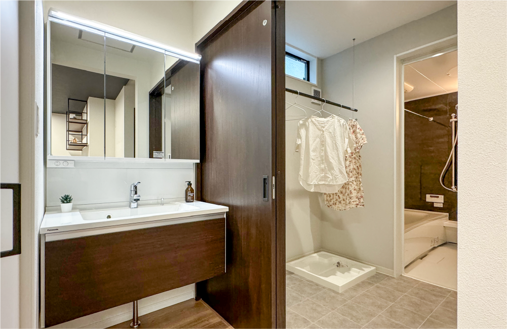 洗面室と脱衣室を分けているので、誰かがお風呂に入っていても気兼ねなく洗面台が使えて、ストレスがありません。脱衣室には室内物干しやガス衣類乾燥機「乾太くん」を設置しているので、夜遅くに洗濯したい時や雨の日の洗濯にも心強い味方です。毎日の家事がぐっとラクになります。