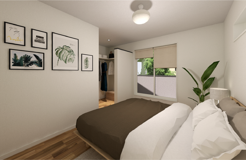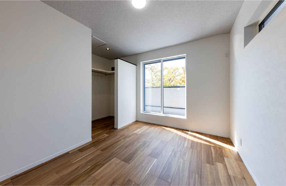 主寝室には、使い勝手の良いウォークインクローゼットを設けました。ご夫婦の衣類やバッグ、小物類までしっかり収納できるので、必要なものもスムーズに取り出せて便利です。荷物がスッキリと片付くことで、お部屋は広く感じられ、落ち着いた空間でゆったりとくつろげます。
