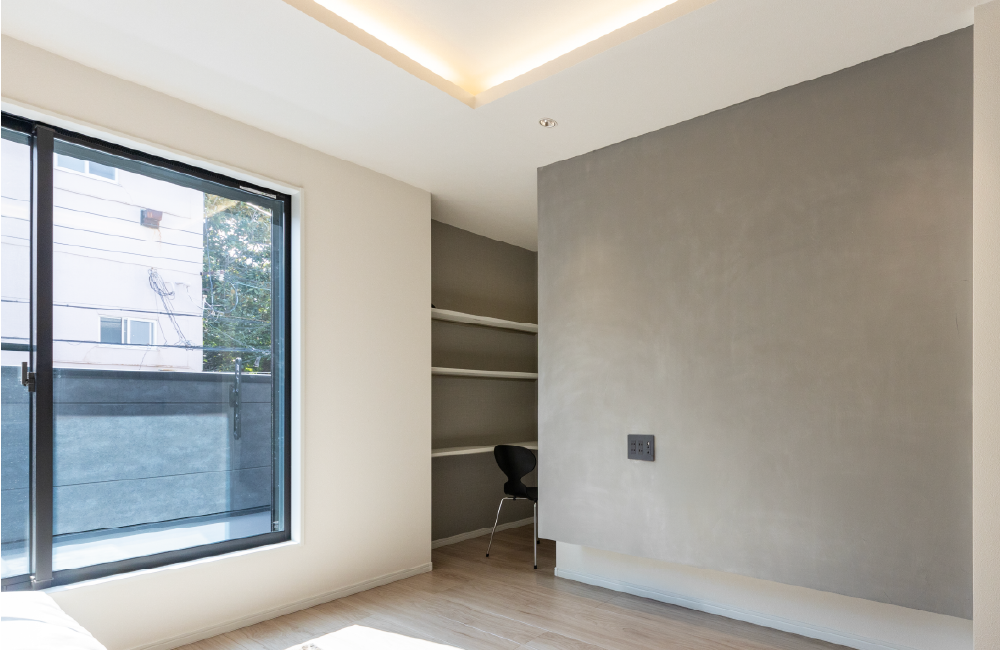 南向きのバルコニーに面したリビングは、陽差しがたっぷりと差し込み、明るく開放的です。折り上げ天井に組み込まれた間接照明が、やさしい光で空間を包み、夜は落ち着いた雰囲気をもたらします。テレビ背面の造作壁はモルタル調の仕上げで、色合いや陰影が美しく、ぬくもりのある空間を演出します。