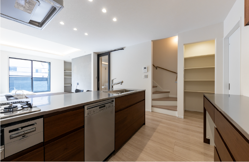 フラットな天板を採用した対面キッチンは、反対側からも手が届く設計で、家族みんなが自然と集まりやすく、食事の準備や片付けもスムーズに行えます。お子さまもお手伝いしやすく、家族のふれあいが生まれるのも魅力です。隣には便利なパントリーがあり、食品や日用品をしっかりと収納できます。