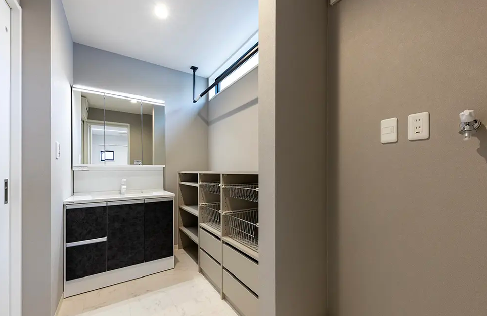 キッチンのすぐ後ろにあるから、お料理の合間にサッと洗濯ができる、快適な家事動線。毎日の家事がぐんとラクになります。室内物干しを設置しているので、天気や時間を気にせず、自分のペースで洗濯ができるのもポイント。さらに、洗剤やタオルなどをスッキリしまえるシステム収納も備えています。