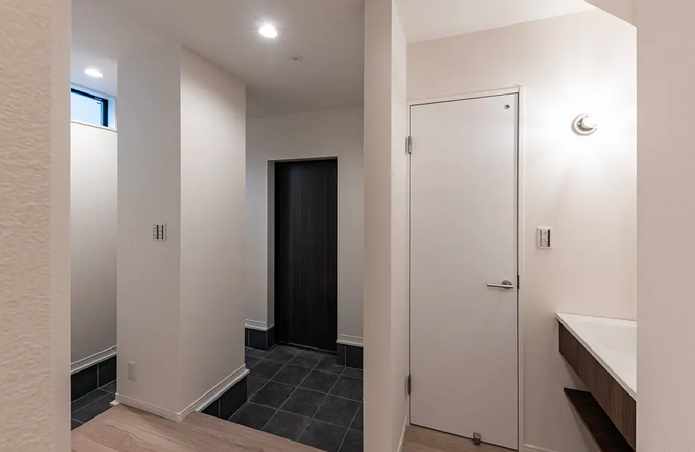 来客は左へ、ご家族は右へと、動線を使い分けられる2WAY仕様の玄関です。家族用の入口は、土間続きの収納スペースにもなっていて、少し汚れが気になるものもそのまま収納できてとても便利。玄関ホールにはセカンド洗面があり、帰宅後すぐに手洗いやうがいの習慣が自然と身につきます。