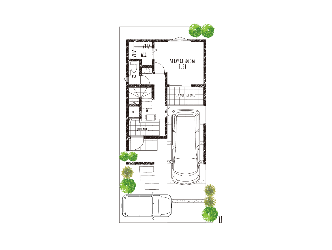 駐車スペース奥のインナーテラスは、住まいの内と外をゆるやかにつなぐ半屋外のアウトドア空間です。屋根があるため天候に左右されにくく、雨の日でも快適に使えるのが魅力。DIYの作業場や自転車のメンテナンススペースとしてはもちろん、観葉植物を育てる場所など、多彩な使い方を楽しめます。