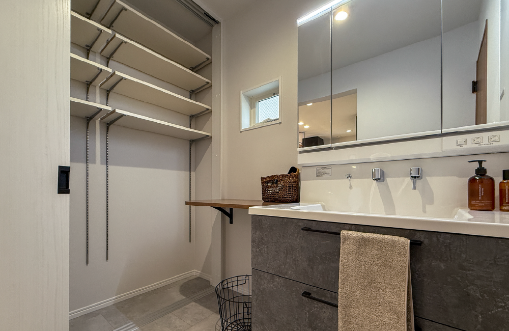 ランドリールームと分かれているため、誰かが入浴中でも気兼ねなく洗面台を使えます。洗面台の横には高さをそろえたカウンターがあり、座ってゆっくりメイクをしたり、アイロンをかけたりと便利に活用できます。収納スペースも備えているので、日用品のストックや小物類もキレイに整理できます。