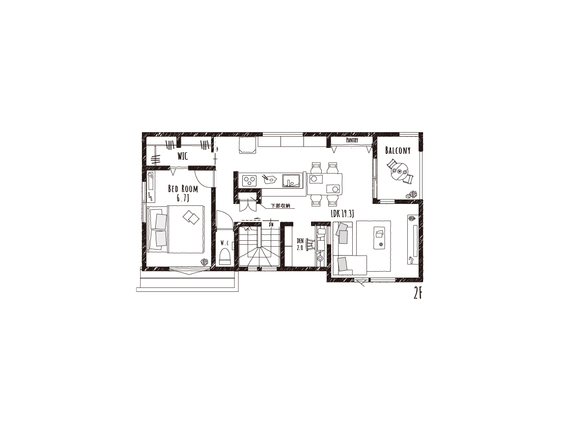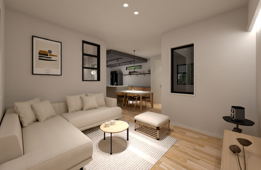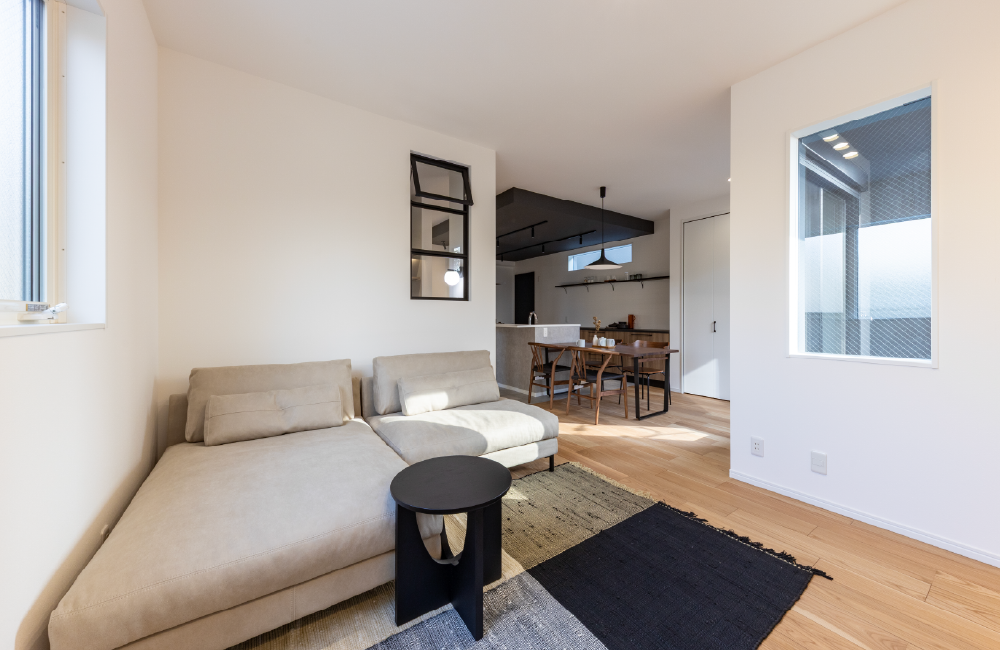 2階の一番奥に配置した天井高約2.6mのリビングは、南側のバルコニーに面した窓からやわらかな光が差し込む、開放感に包まれる空間です。日常の中でホッと一息つきたい時や、家族と一緒にゆったり過ごしたい時にぴったり。安心感と居心地の良さが調和した、心地よいリビングです。