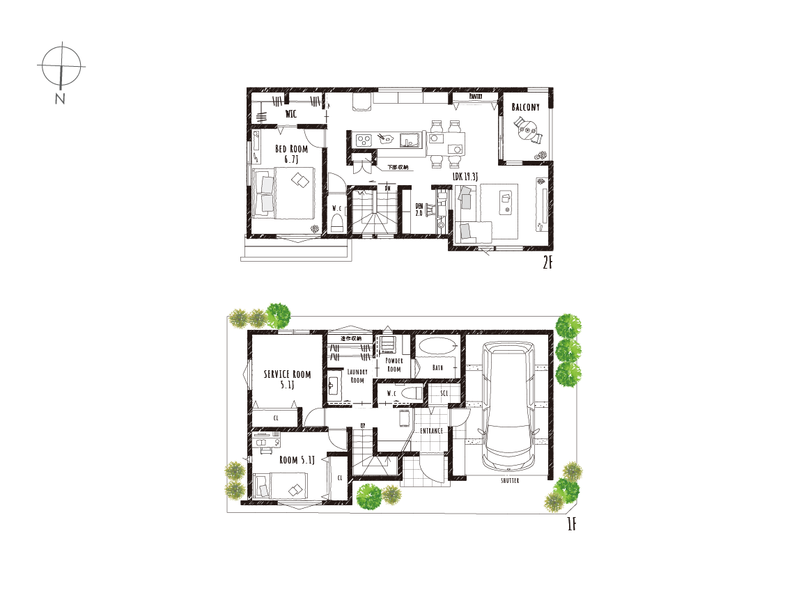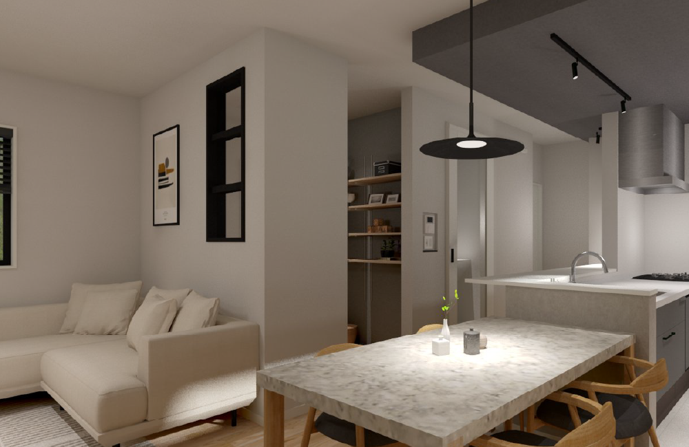 電動シャッター付きの広めのガレージと、光あふれる2階リビングが魅力のお家です。ガレージは大切な愛車を風や雨から守るだけでなく、休日にはメンテナンスをしたり趣味の空間としても活用できるゆとりの広さ。玄関へ直接つながっているので、雨の日でも濡れずに移動できてとても便利です。2階のリビングは天井高約2.6mの開放感あふれる空間。南向きのバルコニーからは心地よい光が差し込み、ゆったりとくつろげます。リビングを2階の奥に配置することで、ゆったりと落ち着いた時間を過ごせるのもポイント。回遊できるキッチンは家事がしやすく、隣接する主寝室のウォークインクローゼットにもつながっているので、身支度もスムーズに。趣味も日常も心地よく楽しめる住まいです。