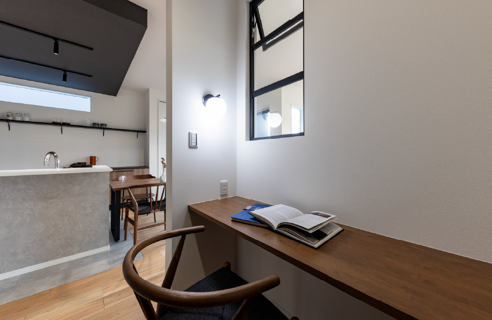 LDKの一角にある書斎は、程よいおこもり感が魅力です。子どもの勉強スペースや家事コーナー、在宅ワークの場所にと多彩に活用できます。キッチンから目が届くので、家事をしながら学習を見守れる安心感もあります。暮らしに寄り添い、毎日にうれしい使い勝手のよさを備えたスペースです。