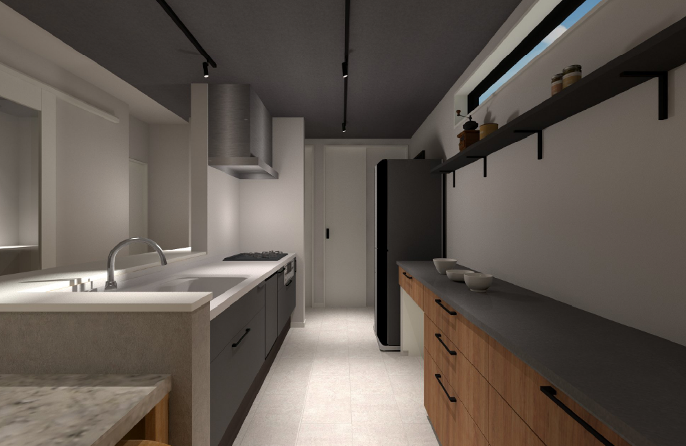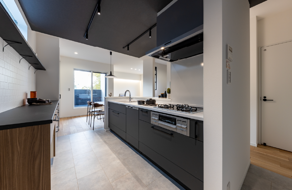 ぐるっと回れる動線で家事がしやすいキッチンは、家族とのコミュニケーションも自然と育まれます。折り下げ天井を取り入れることで空間にメリハリが生まれ、お料理に集中できます。背面のカウンタータイプのカップボードや棚には、お気に入りの食器や調理家電を並べて、見せる収納も楽しめます。