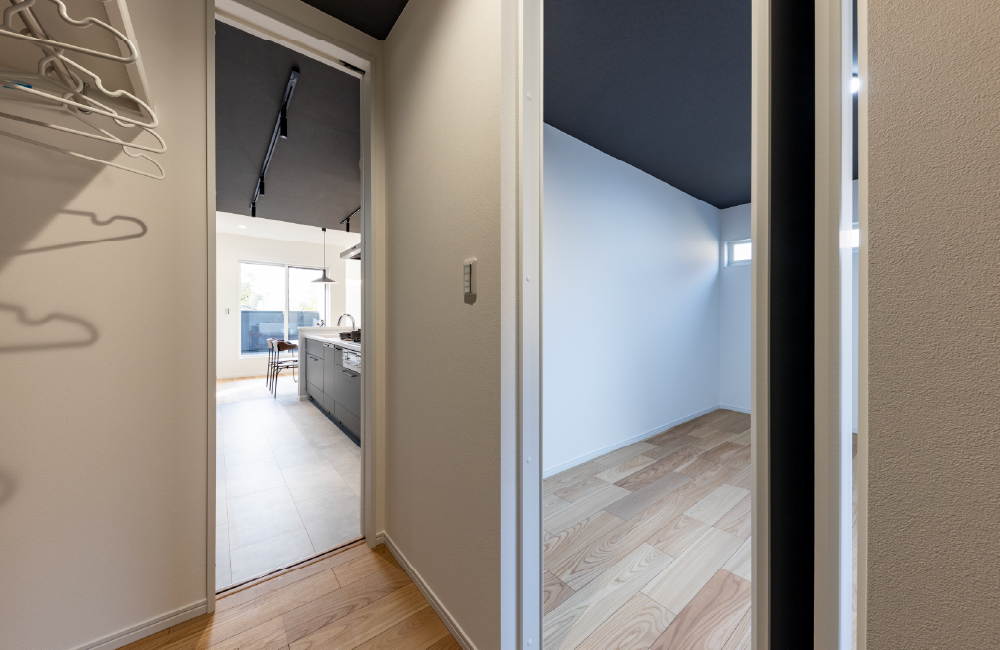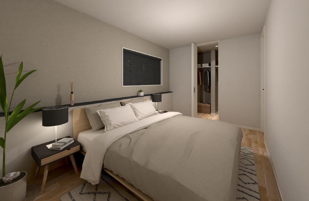 主寝室に設けたウォークインクローゼットはキッチンからも出入りができる2WAY仕様で、洋服をしまうのも取り出すのもスムーズ。お料理の合間にサッと着替えられたり、朝の身支度も効率よくこなすことができます。便利さと快適さを兼ね備えた主寝室で、毎日の暮らしにゆとりが生まれます。