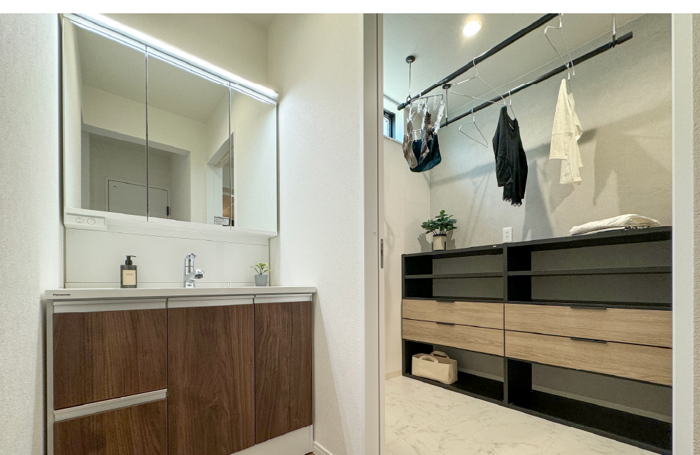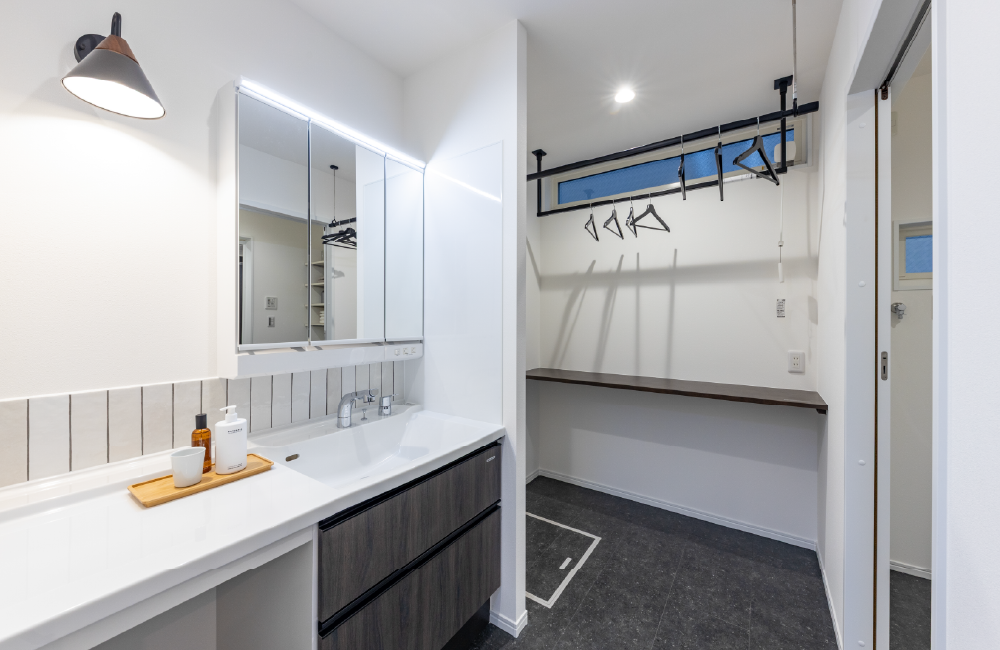 洗面室と脱衣室を分けているので、誰かが入浴中でも気兼ねなく使え、朝の身支度や帰宅後の手洗いもスムーズ。さらに室内物干しやカウンターを備えているから、洗濯して干す・たたむ・しまうまでの流れがここで完結。カウンター下には収納もあり、毎日の家事をラクにする工夫がいっぱいです。