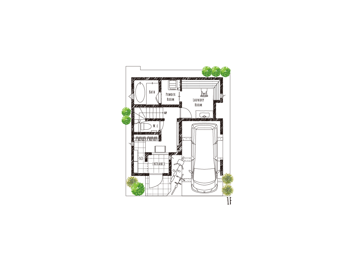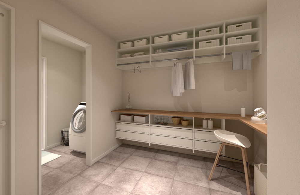 4帖超のスペースに、たっぷりの収納とカウンターのある洗面・ランドリー室です。タオルや日用品をしっかりしまえて、いつでもスッキリ使えます。ハンガーパイプもあるので室内干しができ、天候を気にせず洗濯できます。カウンターでは洗濯物をたたんだり、アイロンがけもスムーズに行えます。