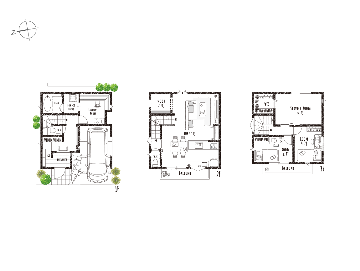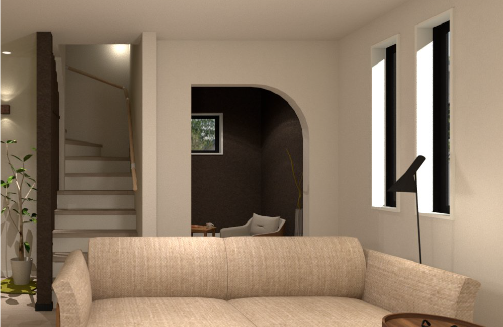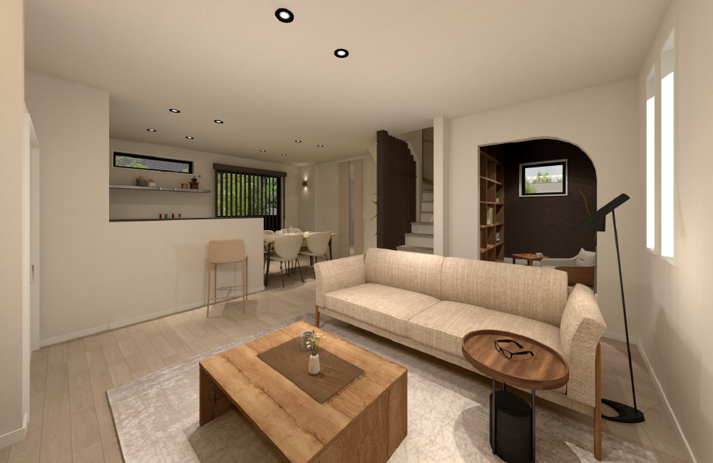 淡いグレーと深みのあるブラウンでまとめた住空間が広がる、心から安らげる落ち着いた雰囲気のお家です。リビングにはやわらかな間接照明の光が灯り、家族がくつろぐ時間をやさしく包み込みます。また、一角にはほどよくこもれる小上がりのヌックを設け、穏やかなひとときを過ごせる場所に仕上げました。3階へと続くリビング階段にはルーバーを一部取り入れ、光と視線が抜けることで空間に開放感と広がりをもたせています。キッチンは収納量をしっかり確保しつつ、カウンタータイプのカップボードや上部に棚を設けることで「見せる収納」も楽しめるとともに、使い勝手にも配慮しています。ダイニングやリビングとの距離も近く、料理をしながらでも家族とのつながりを感じられます。家族の時間も自分だけの時間も大切にできる住まいです。