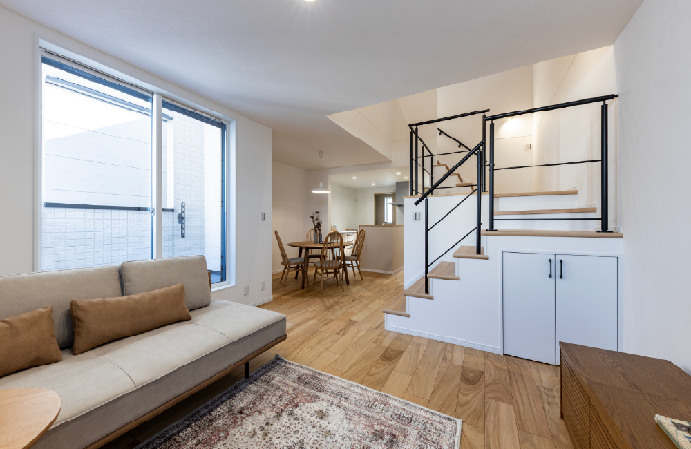 吹抜けとスキップフロアが生み出す、光と風がたっぷり入る広々空間。スキップフロアで高さに変化をつけることで、家の中に自然なつながりが生まれます。上部はお子さまの遊び場や、読書・趣味を楽しむスペースにも。下のスペースは大きな収納になっていて、限られた空間を有効活用しています。