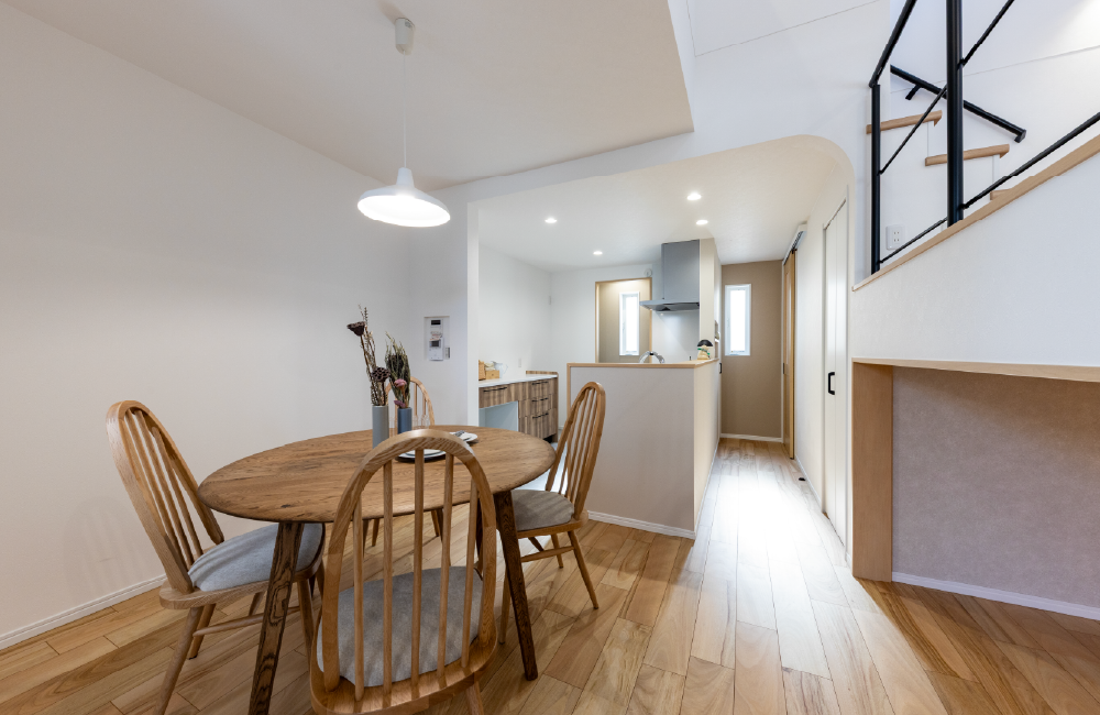 キッチンのすぐよこにダイニングがあるから、配ぜんや後片付けがスムーズ。できたての料理をそのまま食卓へ運べます。キッチンの奥にはパントリーを設け、食材や日用品をしっかり収納。スキップフロアやリビングで過ごす家族のようすを見守りながら、ゆったりとお料理ができるレイアウトです。