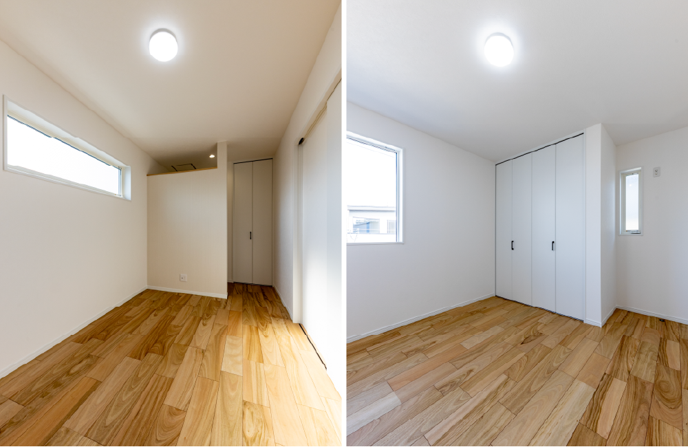 3階にある2つの洋室は、廊下をはさんで向かい合うレイアウト。おたがいのプライバシーをしっかり守りながら、自分の時間をゆったりと過ごせます。どちらも6帖以上の広さがあり、ベッドを置いてもゆとりのある空間です。収納スペースもたっぷりと設けているので、お部屋を広く使えます。