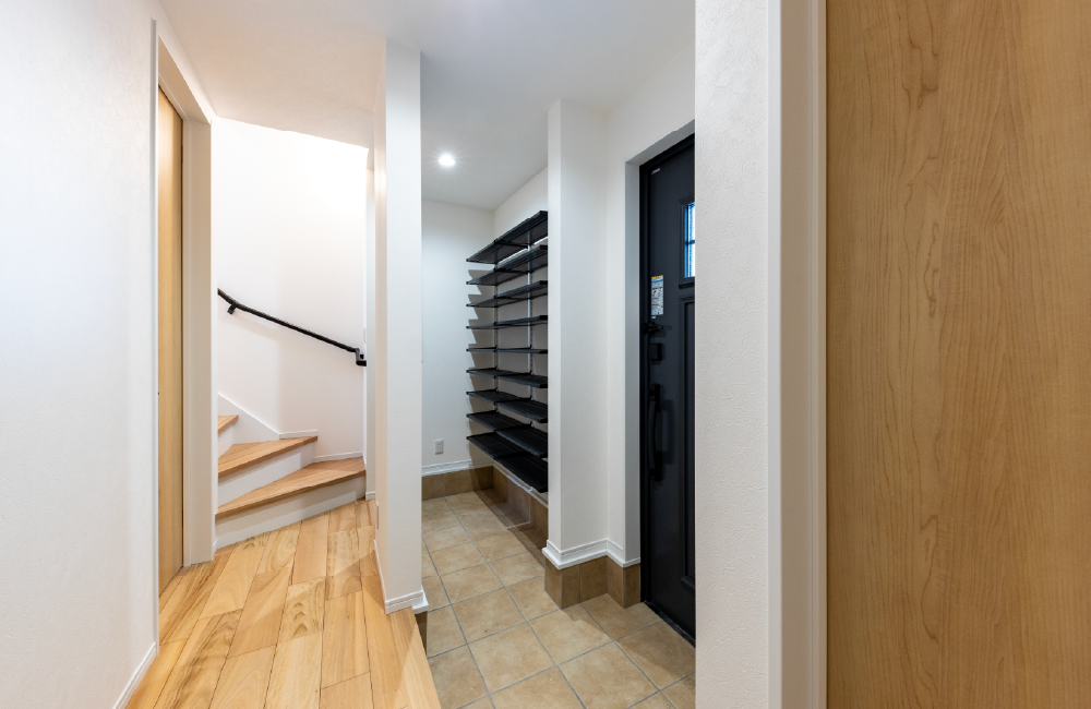 玄関を入るとすぐ右側に、土間続きのシューズクローゼットを設けました。靴の収納はもちろん、ガーデニング道具やアウトドアグッズもまとめてしまえる便利なスペースです。動線がシンプルだから、出かける前の準備も片付けもラクラク。玄関まわりをいつもスッキリと保つことができます。
