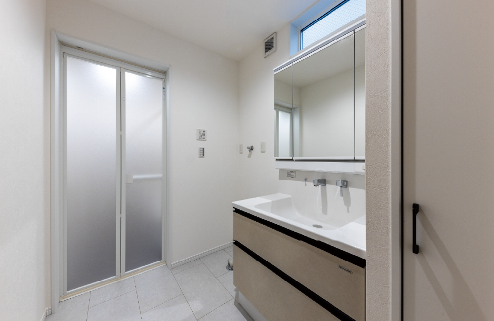 約2.5帖の洗面・脱衣室には、タオルや洗剤をしっかりしまえる便利な収納を設けました。使うものがすぐ手に取れる位置にあるので、家事や身支度がスムーズに進みます。さらに、玄関を入ってすぐの場所にあるため、帰宅後の手洗いやうがいが自然な流れででき、毎日の習慣として身につきます。