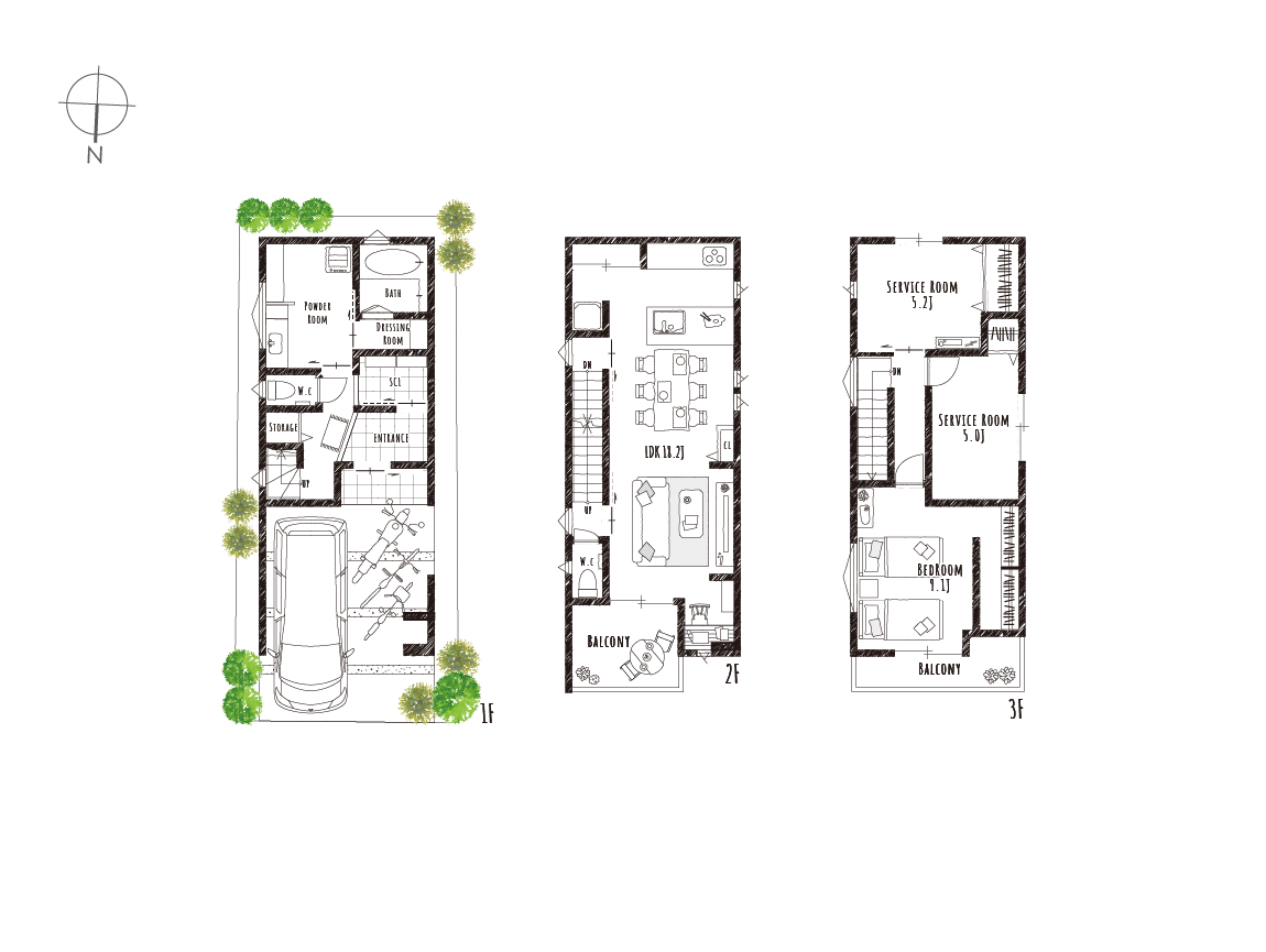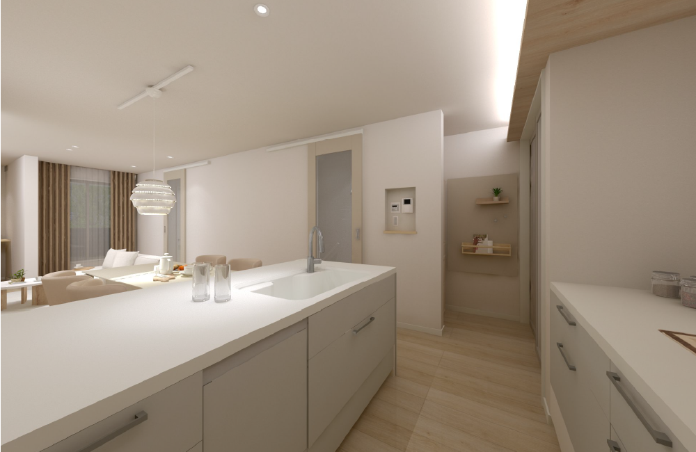 奥行きのある18帖超のLDKで、のびやかに暮らせる心地よいお家です。動線に優れたセパレートタイプのⅡ型キッチンからは、ダイニングやリビングまで見渡せ、料理をしながら家族との会話も楽しめます。隣には使い勝手の良いパントリーがあり、食材のストックやキッチン用品の収納にも便利です。リビングとダイニングの間には袖壁を設け、ゆるやかに空間をゾーニング。間接照明が落ち着いた雰囲気を演出するリビングには、程よくこもれる書斎スペースもあり、在宅ワークや読書にも集中できます。1階の洗面室は4帖超の広さを確保し、室内物干しやカウンターも備えているので、雨の日や夜遅くの洗濯もここで完結でき、家事の負担を軽減してくれます。家族みんなが心地よく過ごせる、工夫いっぱいの住まいです。