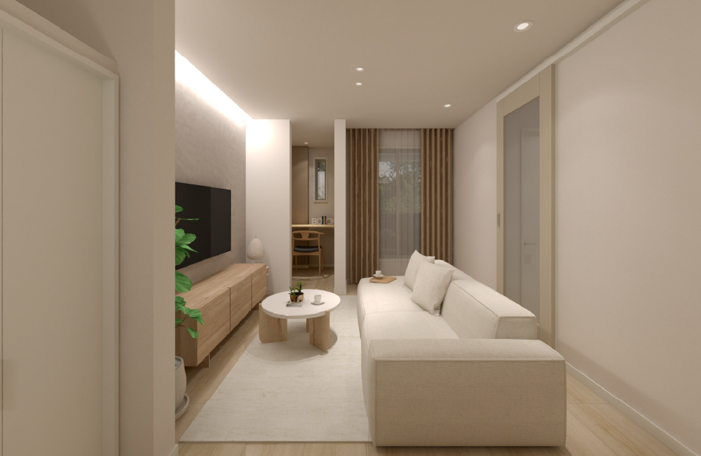 袖壁でダイニングとやさしく仕切り、ひとつながりの空間のまま家族が思い思いに過ごせるリビングにしました。テレビ上には間接照明を入れ、やわらかな光が広がることで奥行きとぬくもりをもたらします。リビングの一角には書斎スペースを設け、気持ちを切りかえて作業しやすい場所を確保しました。