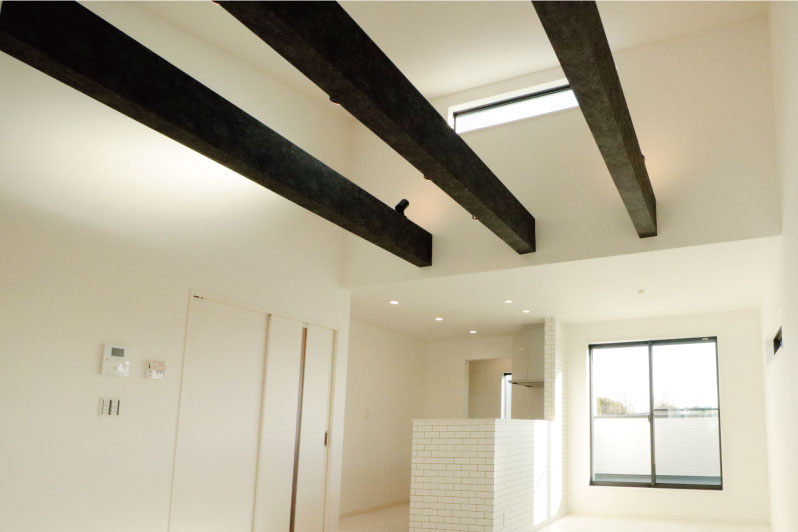 リビング上部は勾配天井にし、窓を設けることで南側の光がリビングに降り注ぎます。明るく開放的な空間になりました。