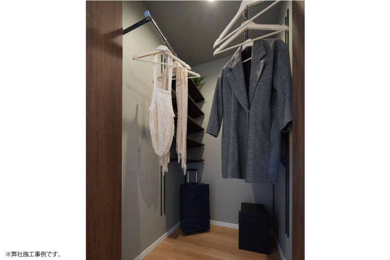 各居室のクローゼットとは別に、1階の中心にウォークインクローゼットがあります。家族みんなで使ったり、季節ものをまとめて収納できます。