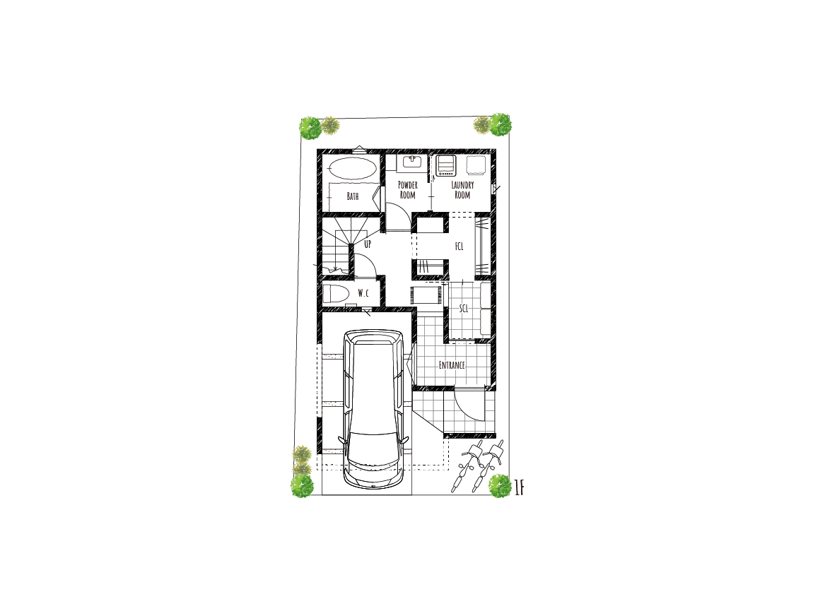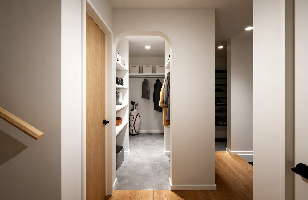 来客用と家族用を分けられる2WAY仕様の玄関です。家族用の入口はシューズクローゼットを兼ねており、靴やガーデニング用品などをすっきり収納できます。そのまま奥へ進むと、ファミリークローゼットへとつながる動線です。帰宅後はコートをかけ、バッグを置いてから2階のリビングへ上がれます。