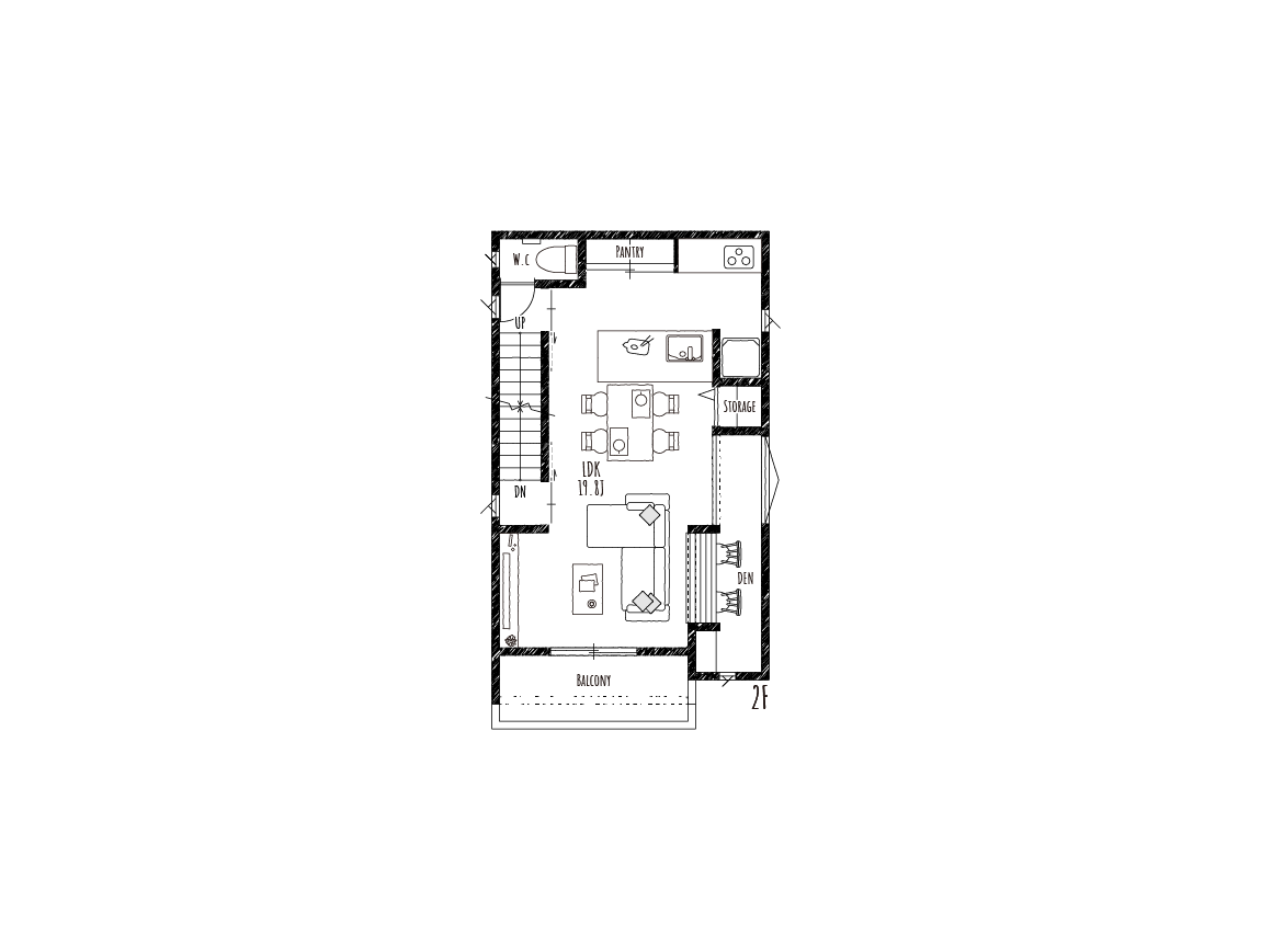 バルコニーに面したリビングは、光と風を感じながら心地よく過ごせる空間です。リビングの後ろには小上がりヌック、となりにはダイニングを配置し、リビング階段を採用しました。家族がそれぞれの場所にいながらもコミュニケーションが取りやすく、いつもおたがいの気配を感じられるレイアウトです。