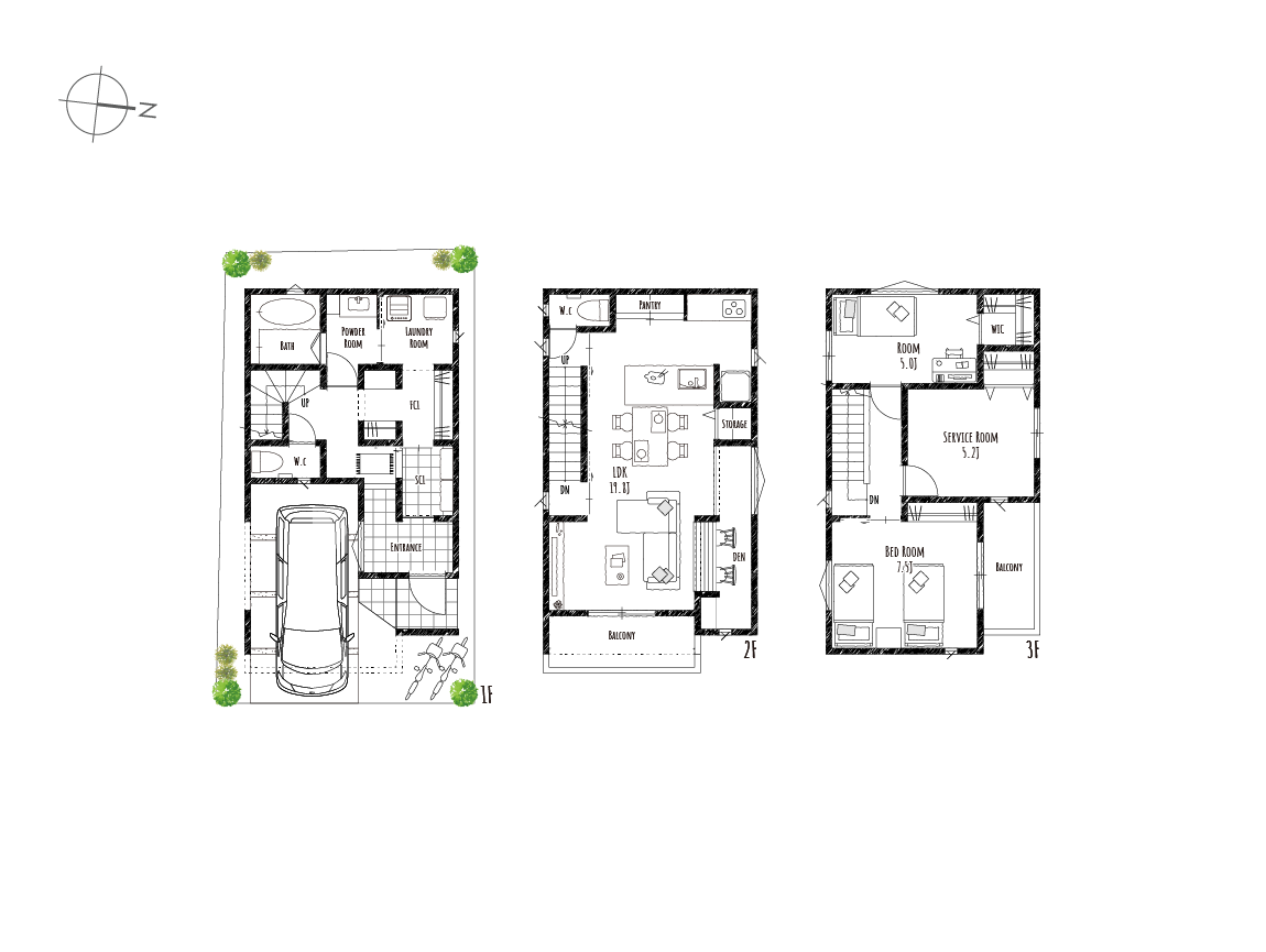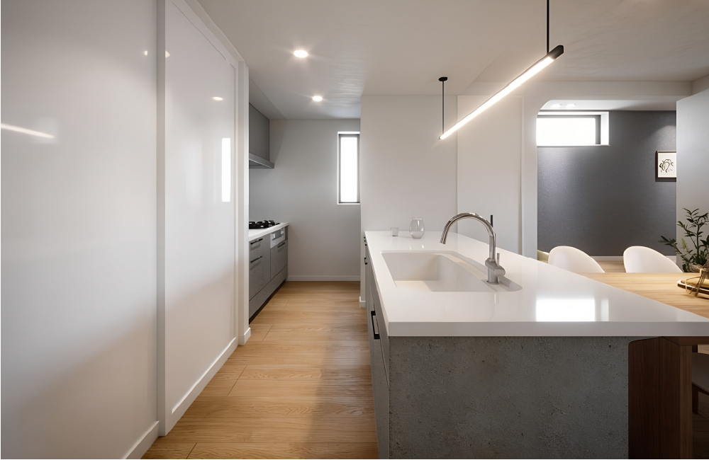 家族時間が広がるLDKに小上がりヌックを設けた、毎日の暮らしにゆとりを生むお家です。シューズクローゼットの入り口やキッチンの下がり天井、小上がりヌックを仕切る垂れ壁にやわらかな曲線を取り入れ、やさしい雰囲気にまとめました。リビングの一角にある小上がりヌックは、子どもの遊び場や宿題スペース、読書やくつろぎ時間にも使える空間。家族が同じ場所にいながら、それぞれの時間を大切にできます。玄関横のシューズクローゼットからファミリークローゼットへ続く動線で、帰宅後はコートやバッグをすぐ収納し、そのまま2階へ。ランドリールームと直結し、ガス衣類乾燥機「乾太くん」で乾かした洗濯物もすぐしまえます。Ⅱ型キッチンは移動距離が短く、配膳や片付けも効率的。家事と子育てを無理なく両立できる住まいです。