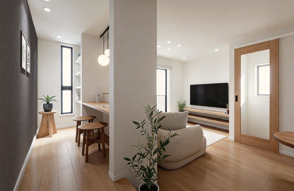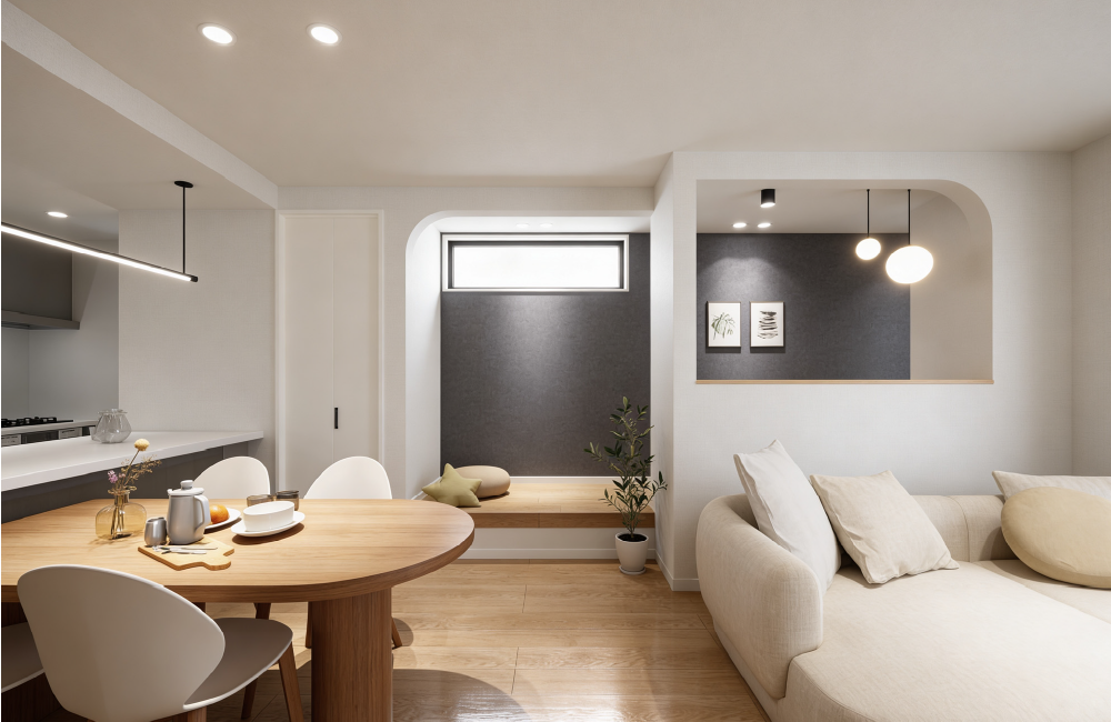 リビングの一角に、小上がりのヌックを設けました。やわらかな印象のアールの垂れ壁でゆるやかに仕切り、ほどよいおこもり感を演出。2人並んで使えるカウンターを設け、読書や在宅ワークにも便利です。リビングとつながる配置なので、家族の気配を感じながら自分の時間も大切にできる空間です。