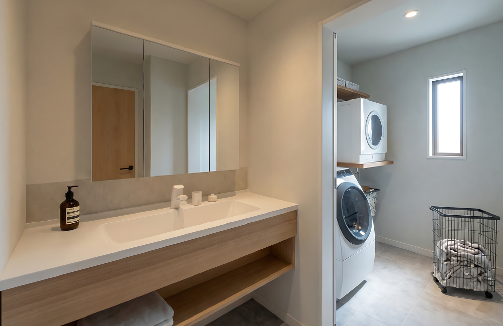 洗面室とランドリールームを分けることで、使いやすさに配慮しました。だれかが洗面台を使っていても、洗濯がしやすい設計です。ランドリールームにはガス衣類乾燥機「乾太くん」を設置。さらに隣にファミリークローゼットをつなげました。乾燥後の衣類をそのまま収納でき、移動の手間を減らします。