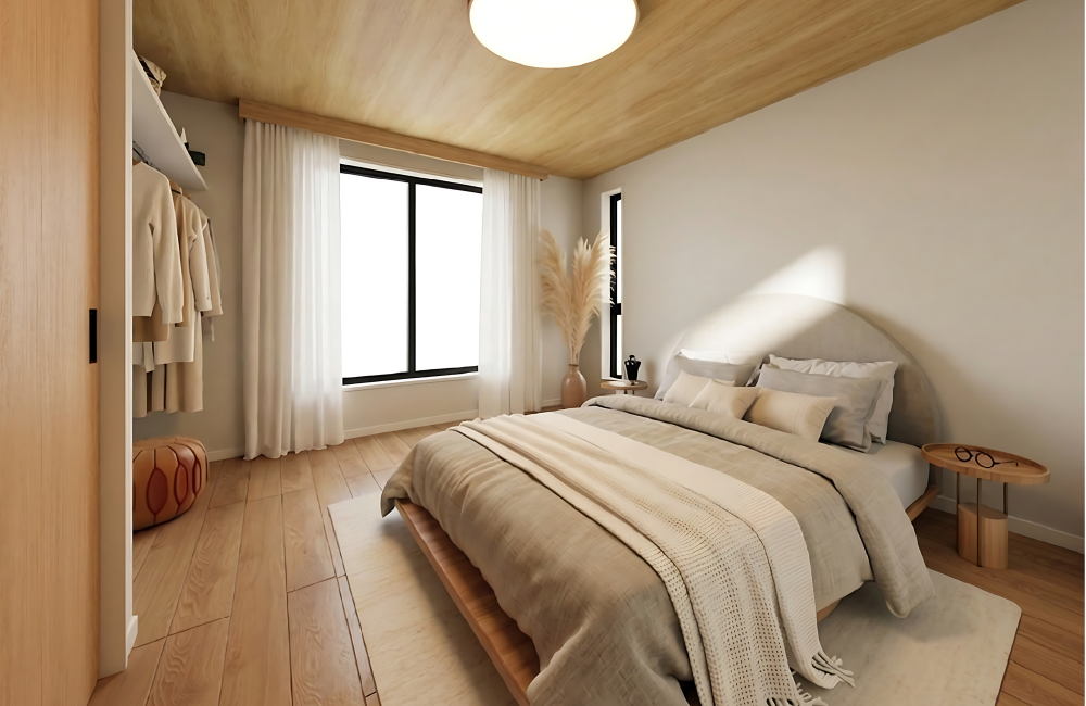 3面開口の主寝室は、バルコニーにも面した開放感あふれる空間です。朝はやわらかな光が差し込み、窓を開ければ心地よい風が通り抜けます。収納には扉のないオープンクローゼットを採用。衣類をサッと取り出せるため、朝の準備もスムーズに行えます。広がりと機能性を兼ね備えたゆとりの空間です。