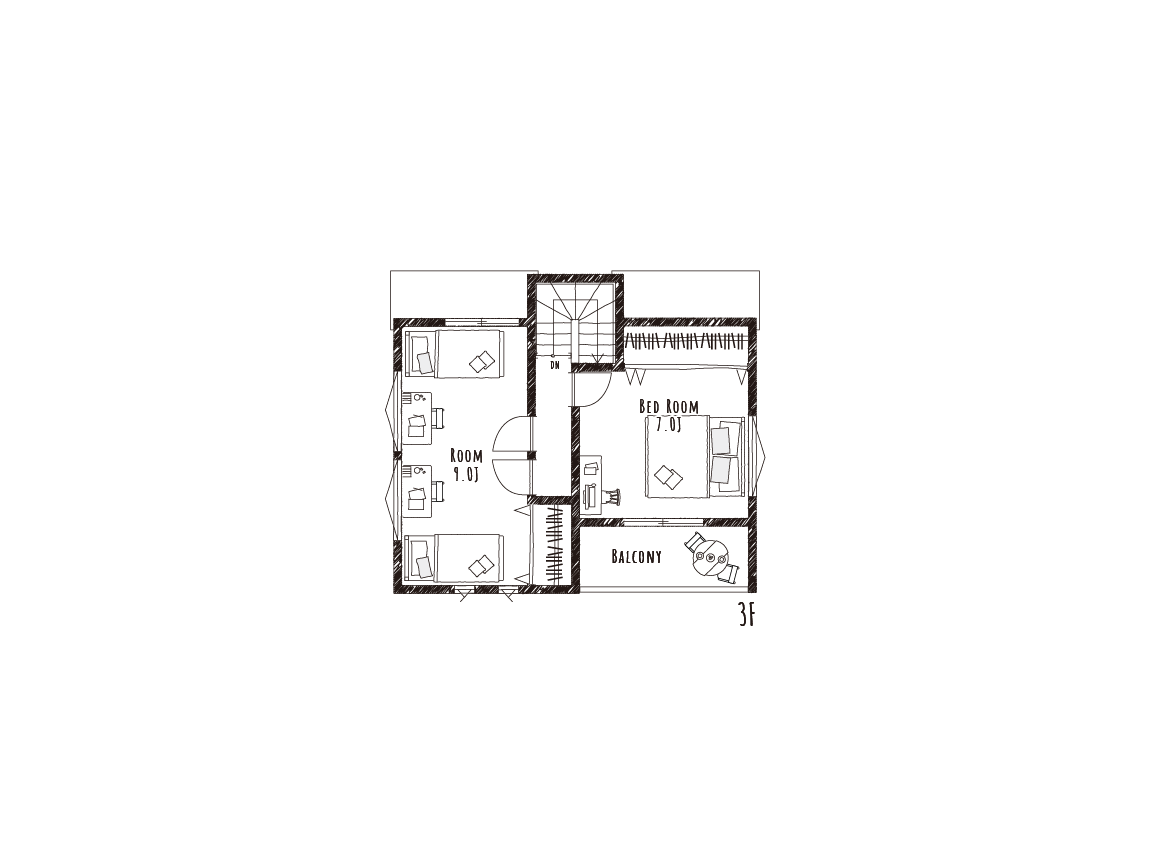 3階には、将来の使い方に合わせて仕切ることができるお部屋をご用意しています。お子さまが小さい時期は、広々とした一つの空間としていっしょに使えます。成長してそれぞれの部屋が必要になった際には、壁を設けて2部屋に分けられ、暮らしの変化に合わせて使い方を切り替えられます。