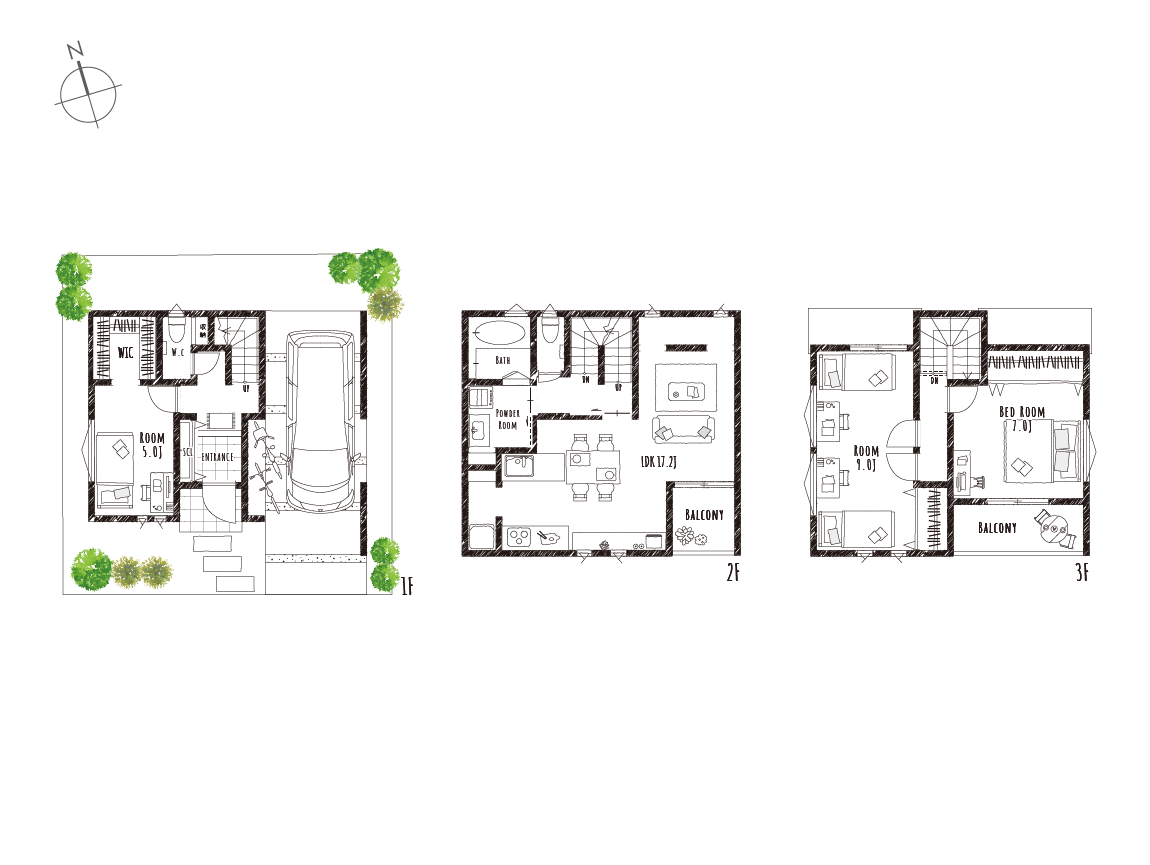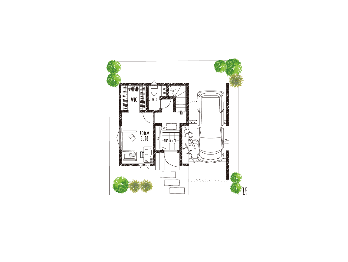 心地よい陽光に包まれ、ゆとりを感じながら日々を過ごせる、南向きで間口の広いお家です。南向きならではのやさしい光が1日を通して差し込み、忙しい朝のひとときも、休日のくつろぎの時間も、やわらかく包み込んでくれます。LDKに入ると、正面にはダイニングキッチン、左手にはリビングがゆったりと広がります。空間をほどよくゾーニングすることで、それぞれが別のことをしていても家族の気配を感じられ、さりげないつながりが生まれます。作業動線がスムーズなセパレートタイプのⅡ型キッチンには、奥に便利なパントリーを設置しました。ものが散らかりがちなリビングには回遊できる収納スペースを設け、家族が集まる空間をいつでもスッキリと保つことができます。家事のしやすさとくつろぎやすさを大切にした、毎日の暮らしにそっと寄り添う住まいです。