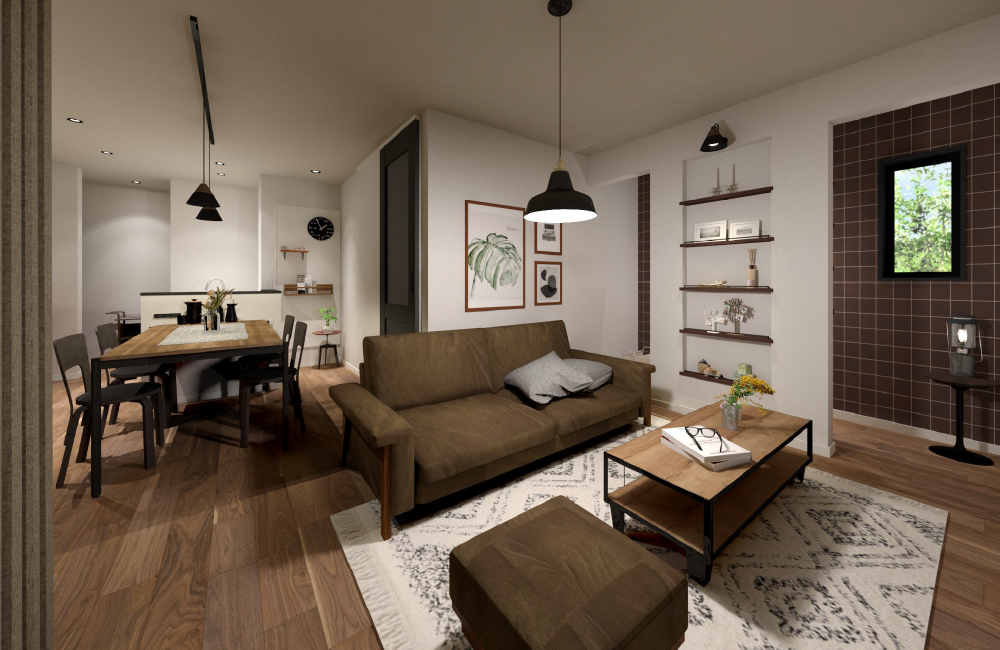 南側のバルコニーから、やさしい光がたっぷり入るリビングです。回遊できる収納スペースがあるので、使ったものはすぐに片付けやすく、生活感を出さずに過ごせます。ダイニング・キッチンとはゆるやかにつながりながら、空間を分けているため、食事とくつろぎの時間をほどよく切り替えられます。