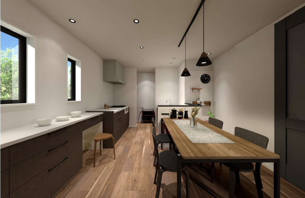 シンクからコンロへの移動は、振り返るだけと短い動線が魅力で、作業が快適なセパレートタイプのⅡ型キッチンを採用しています。キッチンの奥にはパントリーを設け、食材や日用品のストックもすっきり収納可能。ダイニングをすぐ隣に配置しているため、料理の配膳や後片付けもラクラクです。