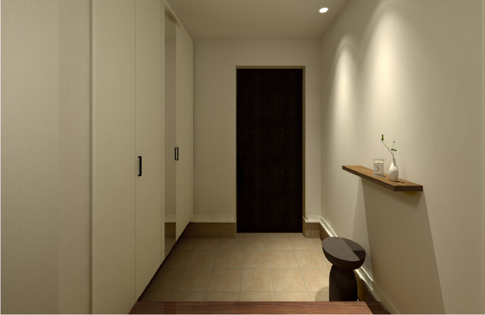 玄関には飾り棚を設け、実用性とインテリア性を両立しています。鍵や小物を置いたり、季節の雑貨やグリーンを飾ったりと、使い方は自由。トールタイプの玄関収納は、家族みんなの靴をしっかり収納できます。さらにミラーを備えているため、外出前にさっと身だしなみをチェックできて便利です。