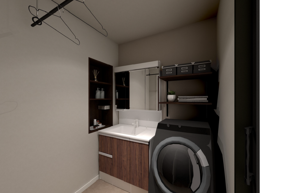 洗面台のとなりに、少し奥行きのある収納を設けました。メイク道具やスキンケア用品をまとめてしまえるため、朝の身支度もスムーズです。室内物干しを設置しているので、雨の日や夜遅い時間の洗濯にも対応できます。時間や天気に左右されにくく、毎日の家事を無理なく支えてくれる空間です。