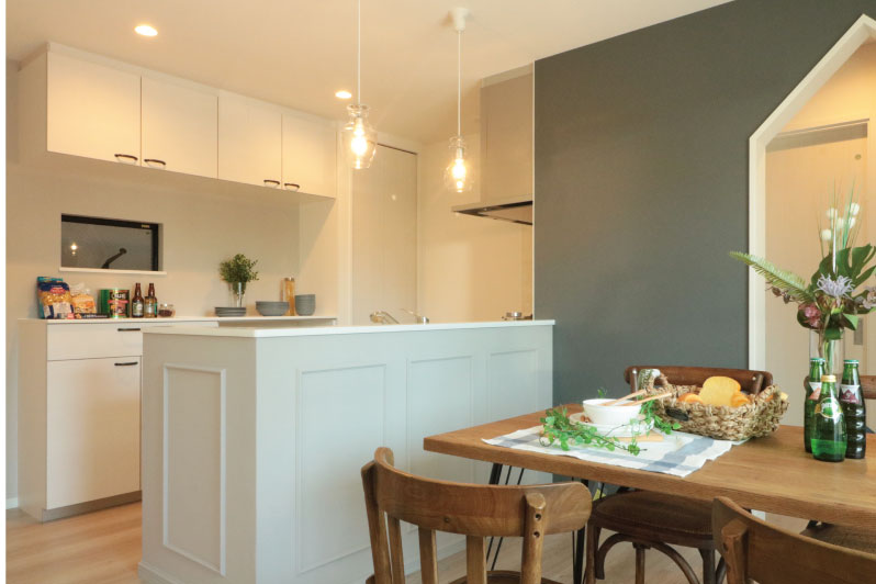 玄関やリビングには、目を引く丸や三角の垂れ壁。キッチンの壁には、憧れの海外ドラマに出てくるようなモールディングという縁取りを施しました。毎日の暮らしを楽しく飾るアクセントがちりばめられています。
