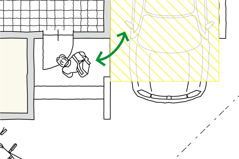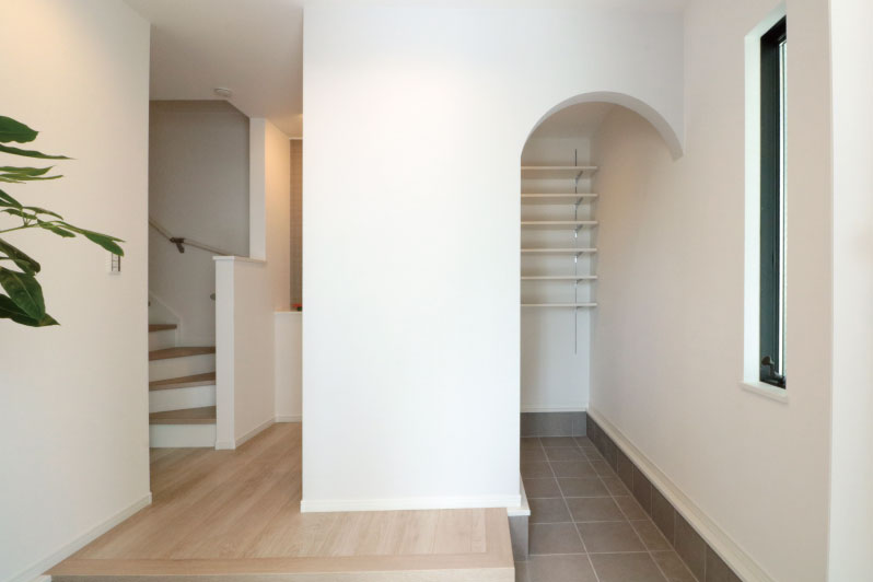 雨が降っても濡れずに車からお家へ移動できるガレージと玄関。たくさんお買い物をしても出入りがしやすいよう、広めにつくりました。